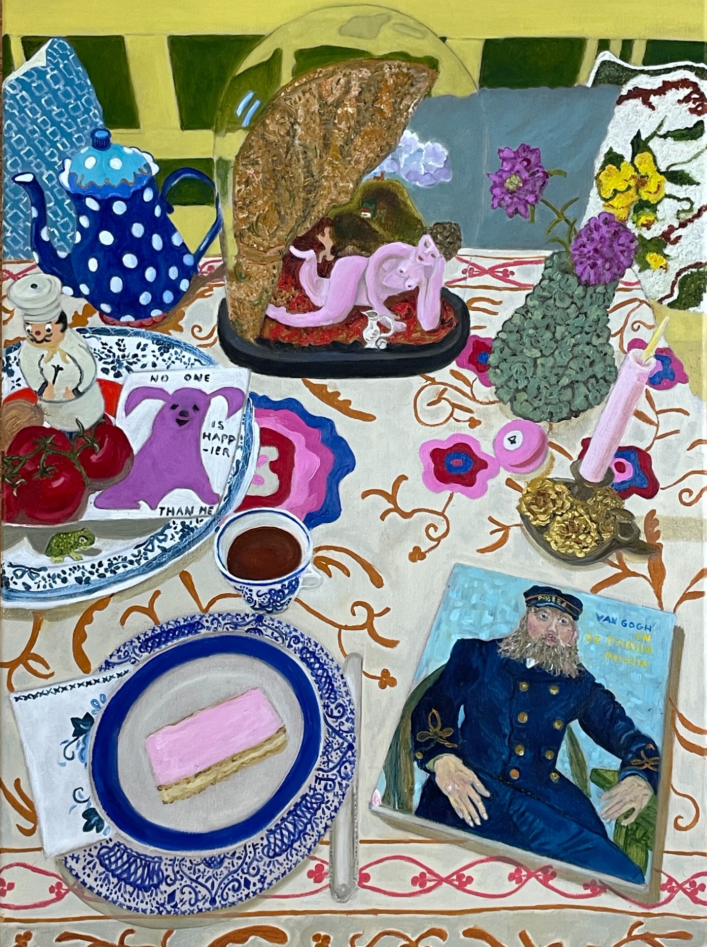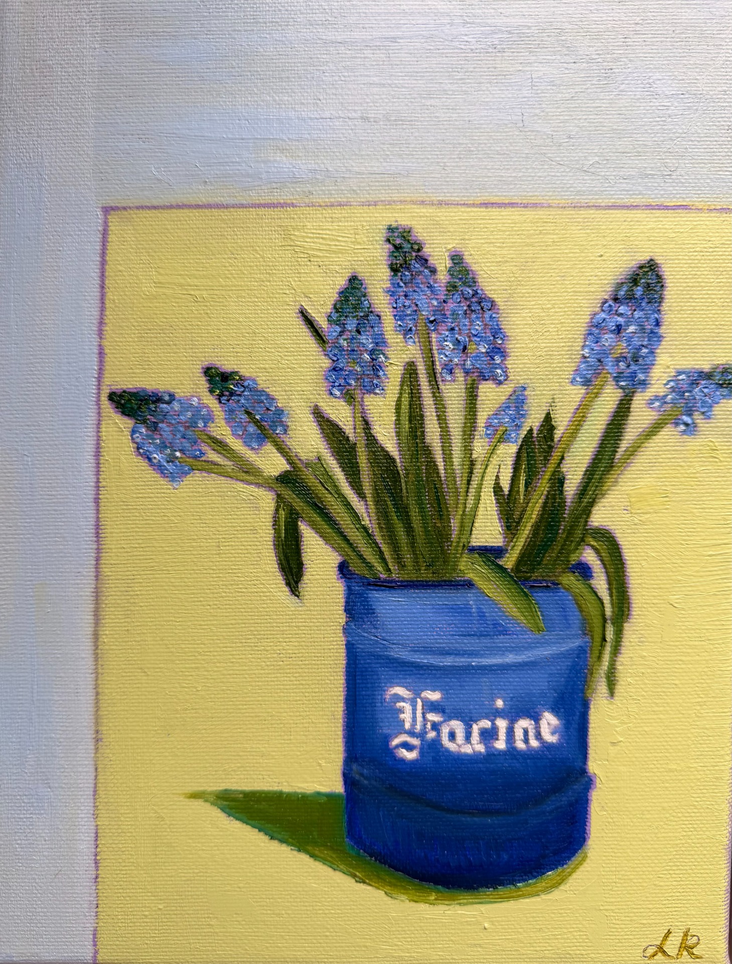 Blue grape hyacinths are the herald of spring but still need time to pop up their nodding blue heads outside in the cold. We can't wait for it to start but how lovely to have a winter feel too? And to know you can long for spring and all of it is yet to come! Time flies and I'm so grateful to live in a country with seasons. To have them today on my table to paint is a feast but it makes me a bit of a cheat as in the garden the snowdrops are blooming their little hearts out and the witch hazel spoils my nostrils with her gorgeous scent and the Hellebores are trying their best! But here they are my flowers in a flour pot. 18cmx24cm Oil on canvas Framed Shipping Costs: Netherlands included European Union 40 Euro UK 50 Euro USA 50 Euro ROW 85 Euro