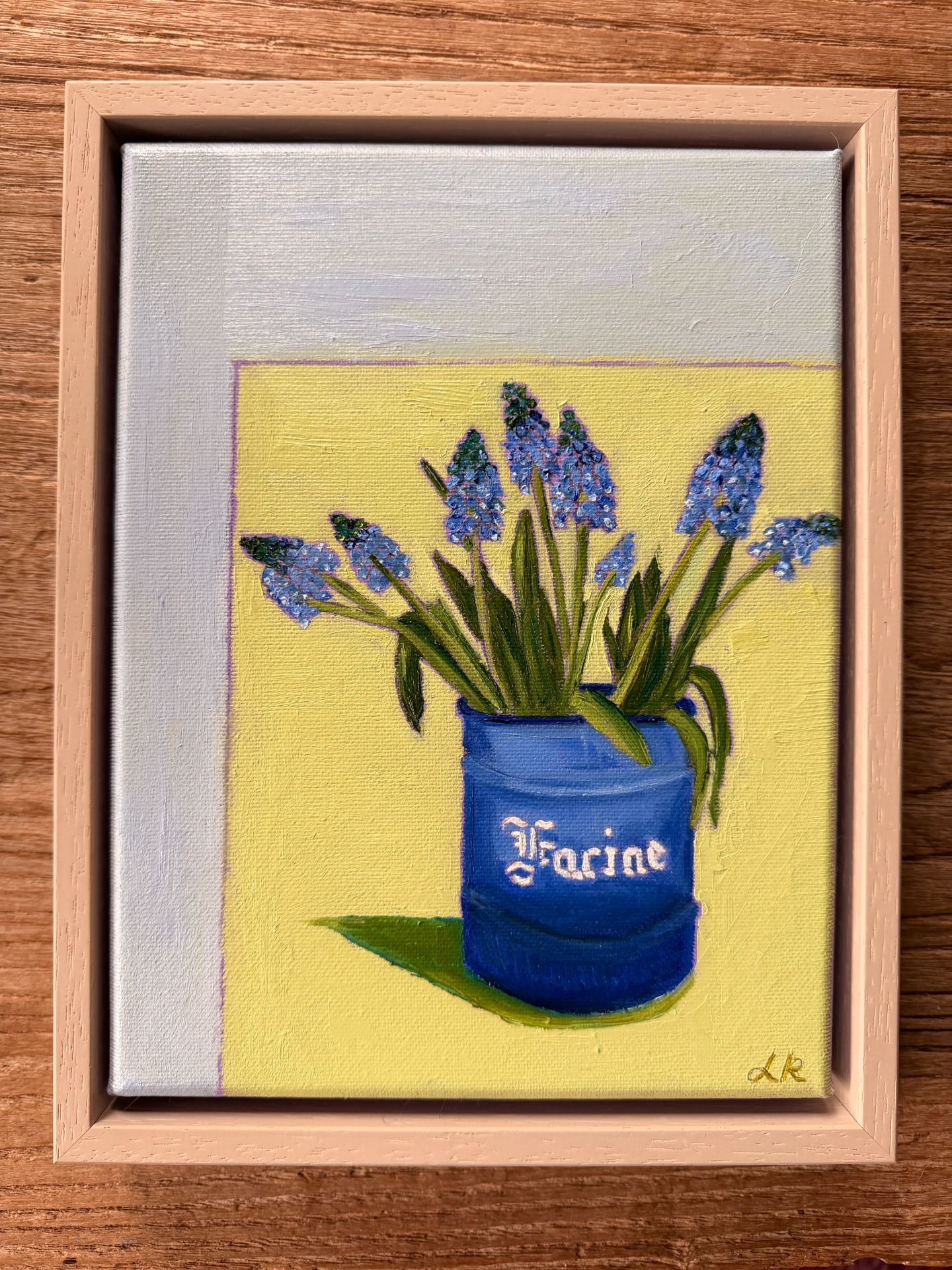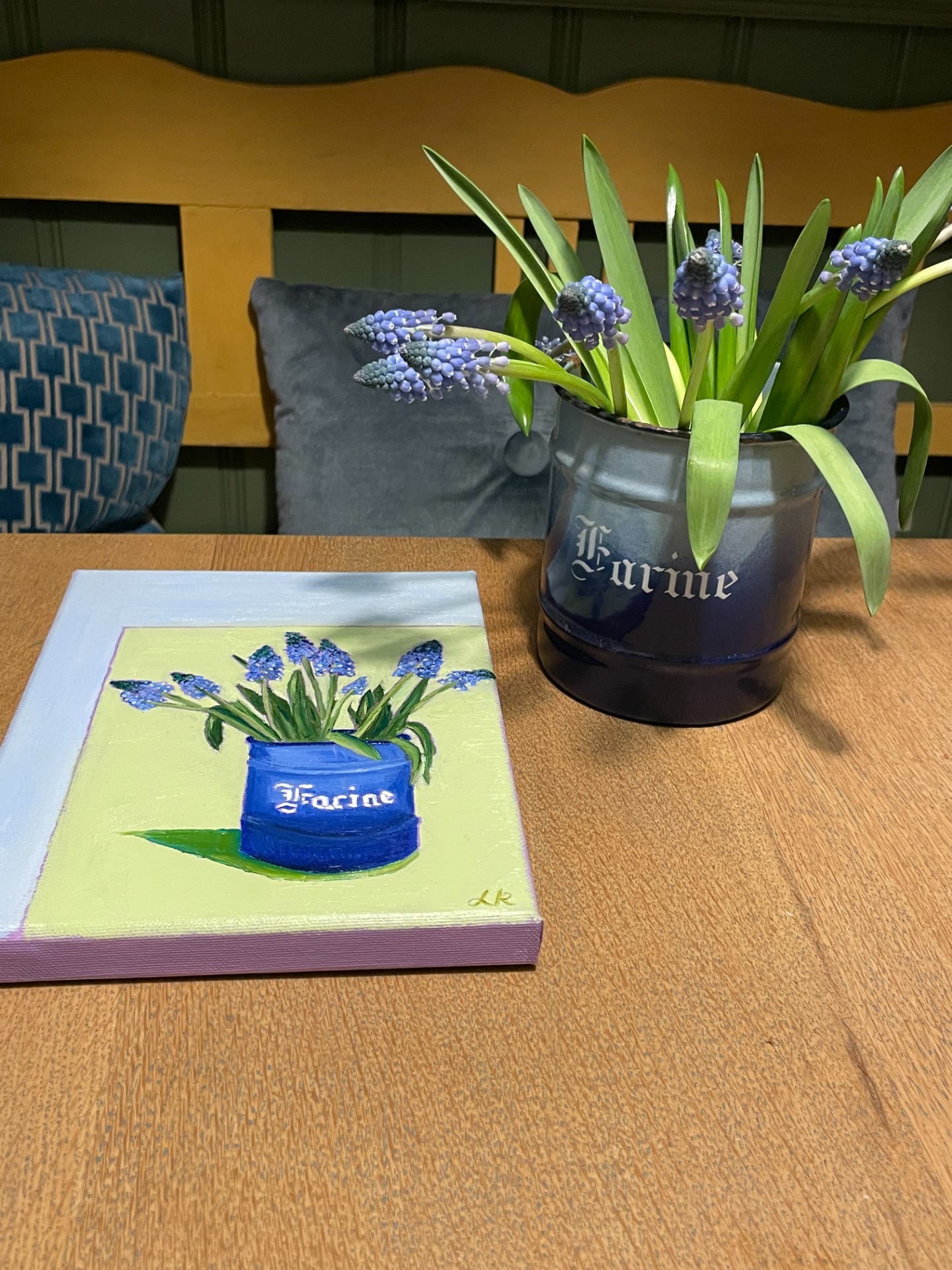 Blue grape hyacinths are the herald of spring but still need time to pop up their nodding blue heads outside in the cold.